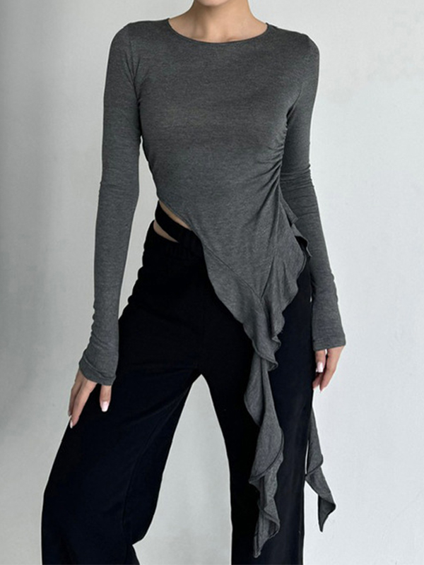 Solid Off Shoulder Irregular Slit Hem Long Sleeve Tee