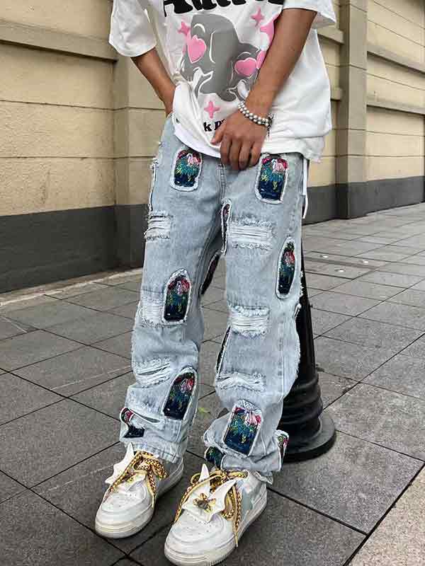 Men’s Ripped Embroidery Patch Loose Jeans