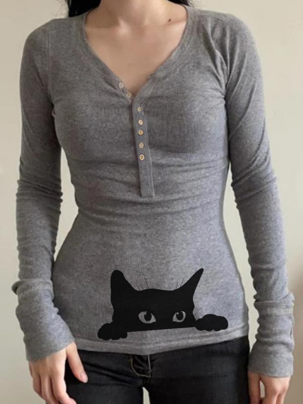 Cat Print Button-Up Slim Fit Long Sleeve Knits