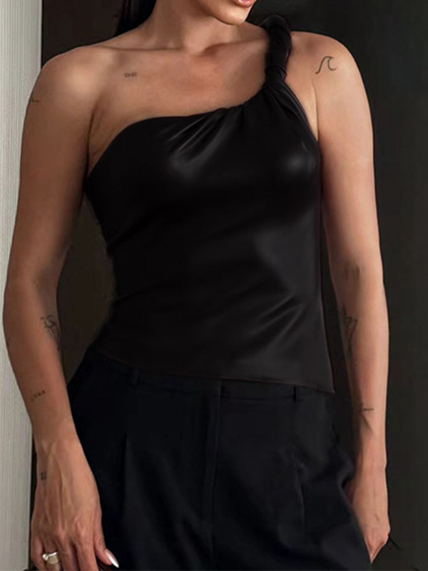 One Shoulder Asymmetric PU Leather Casual Tank Top