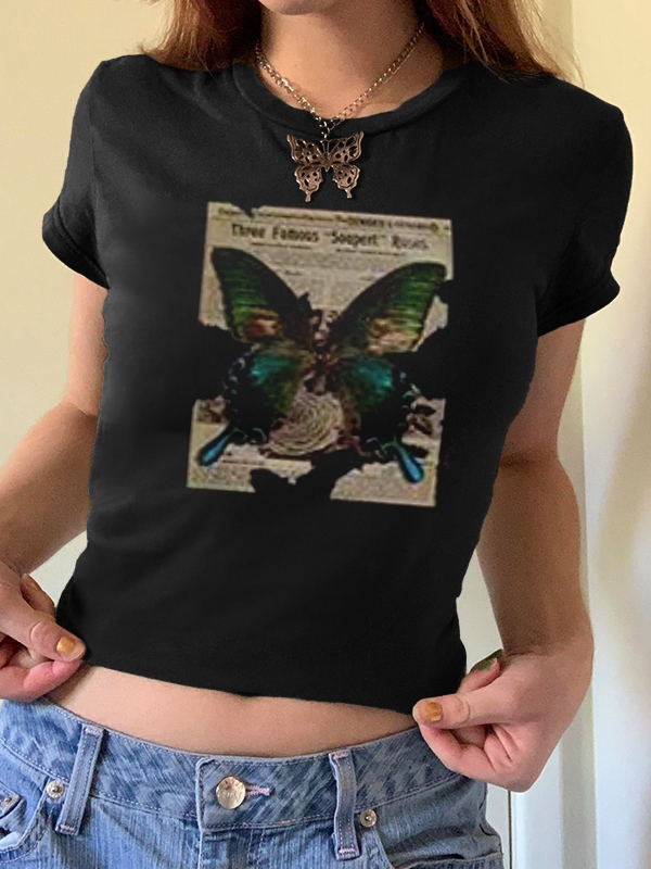 Vintage Brown Butterfly Print Short Sleeve Tee