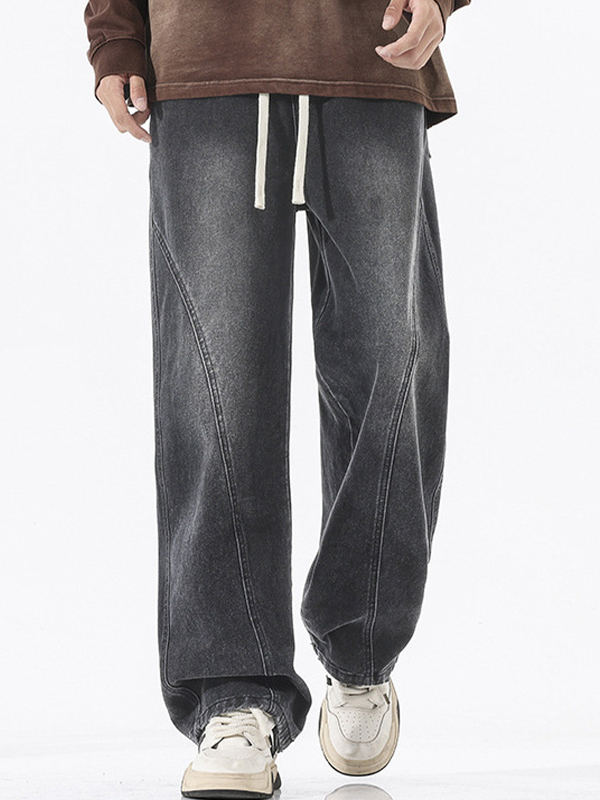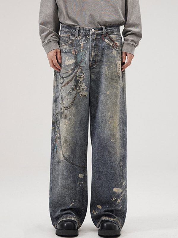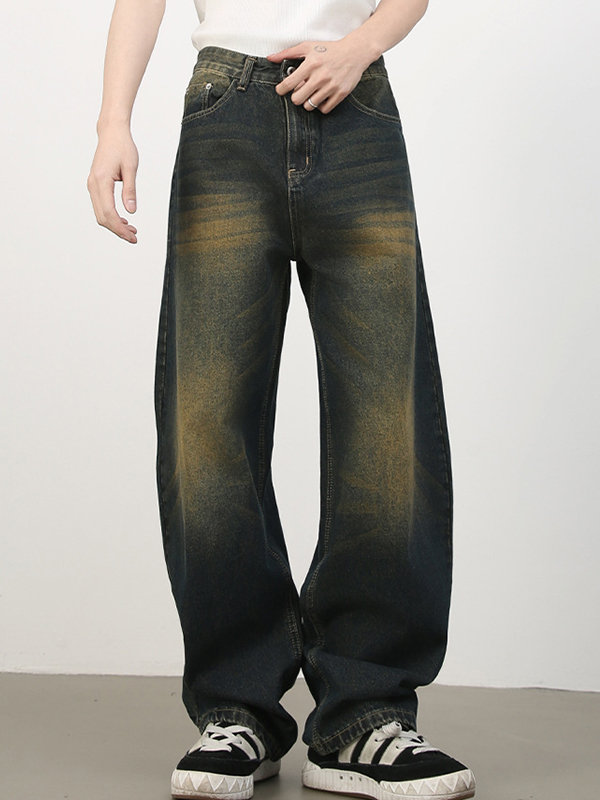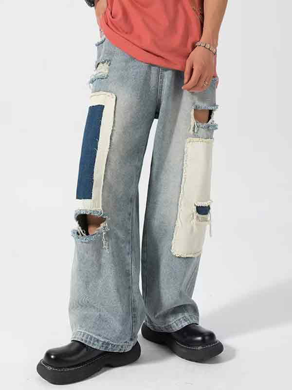 Men’s Vintage Ripped Patch Contrast Color Loose Jeans