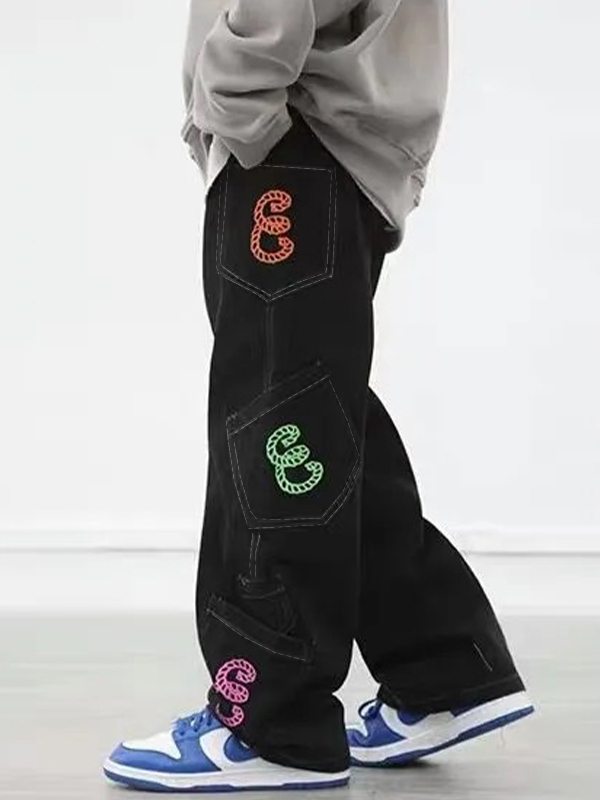 Men’s Multiple Pocket Colorful Print Loose Jeans