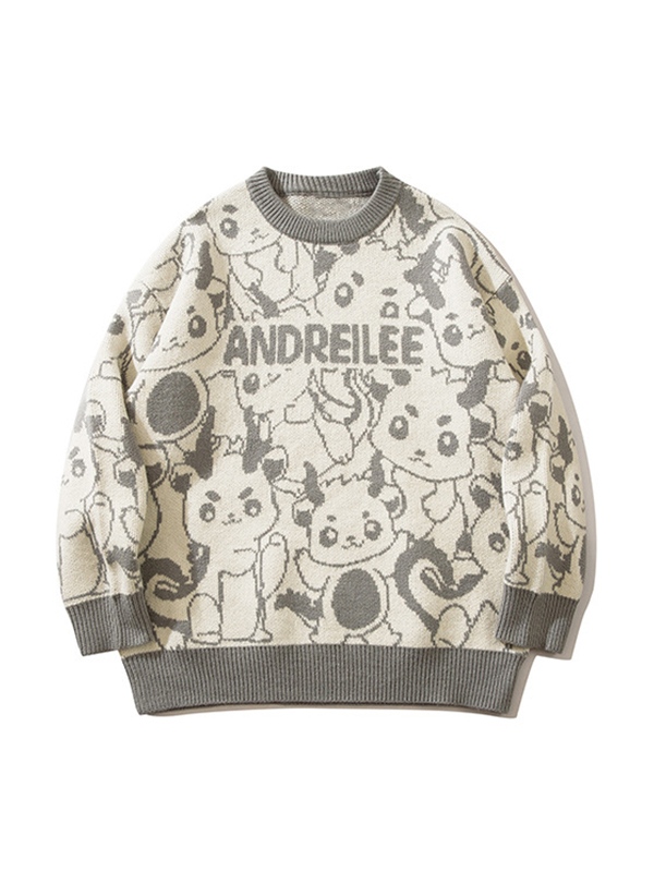 All Over Cartoon Jacquard Crew Neck Knit Sweater