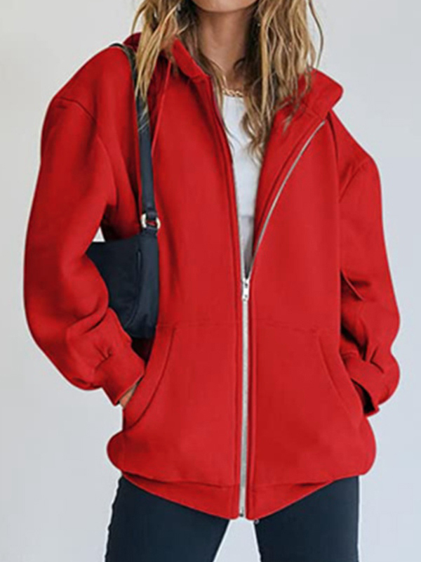 Solid Drawstring Zip Up Oversized Hoodie
