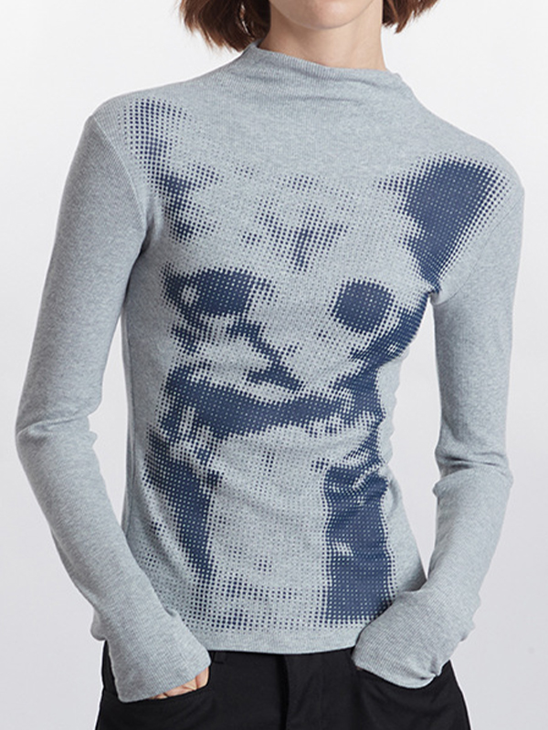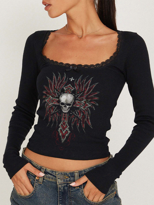 Skull Cross Print Lace Trim Long Sleeve Knit