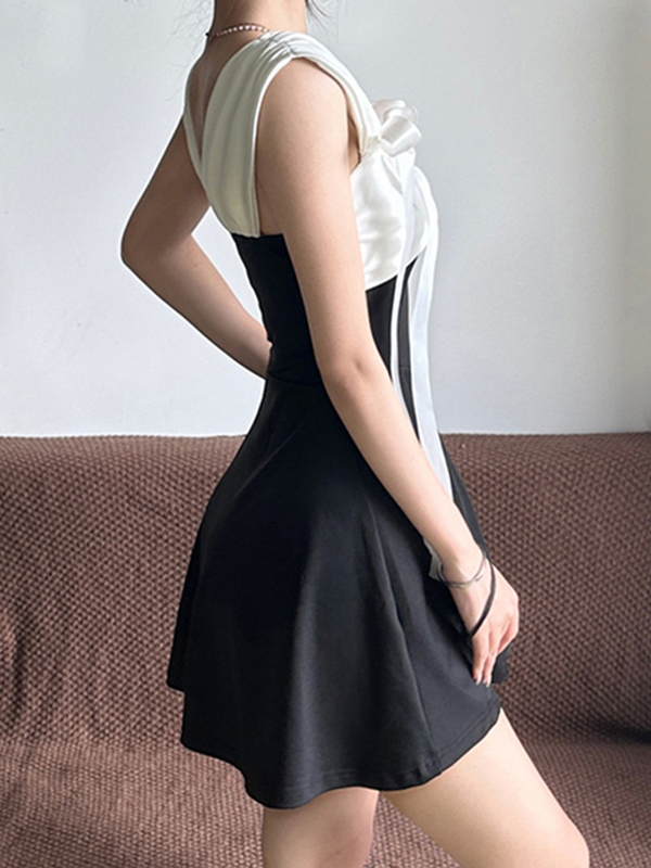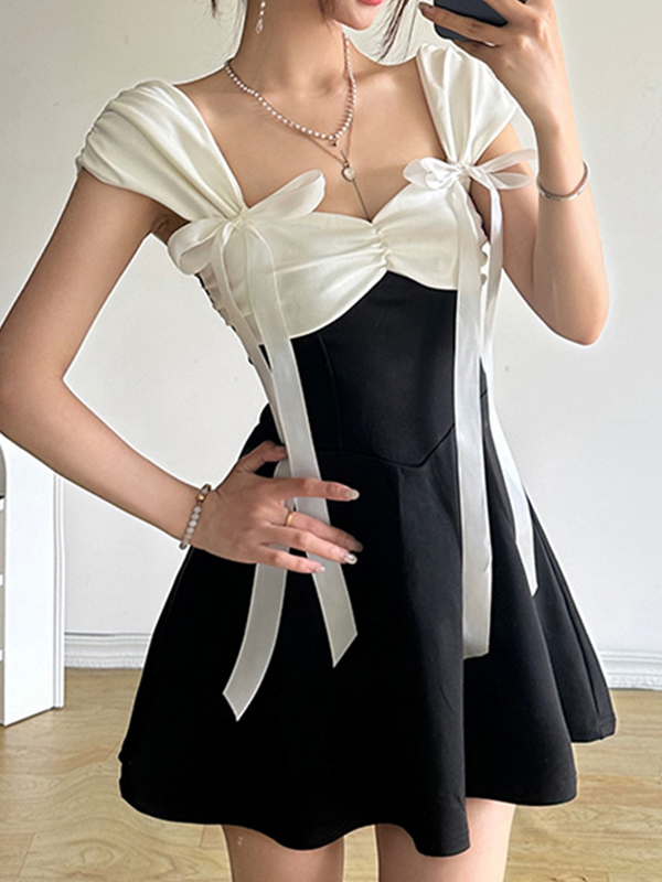 Black White Contrasting Square Collar Bust Pleats Mini Dresses