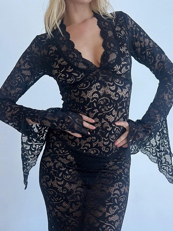 Deep V Lace Pattern See-Through Slim Fit Maxi Dress