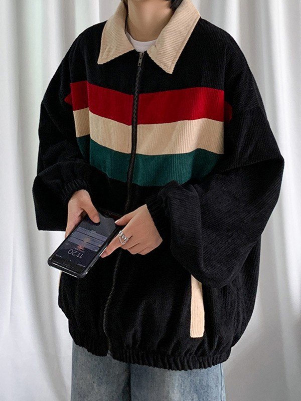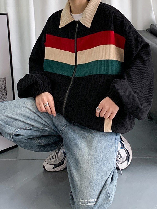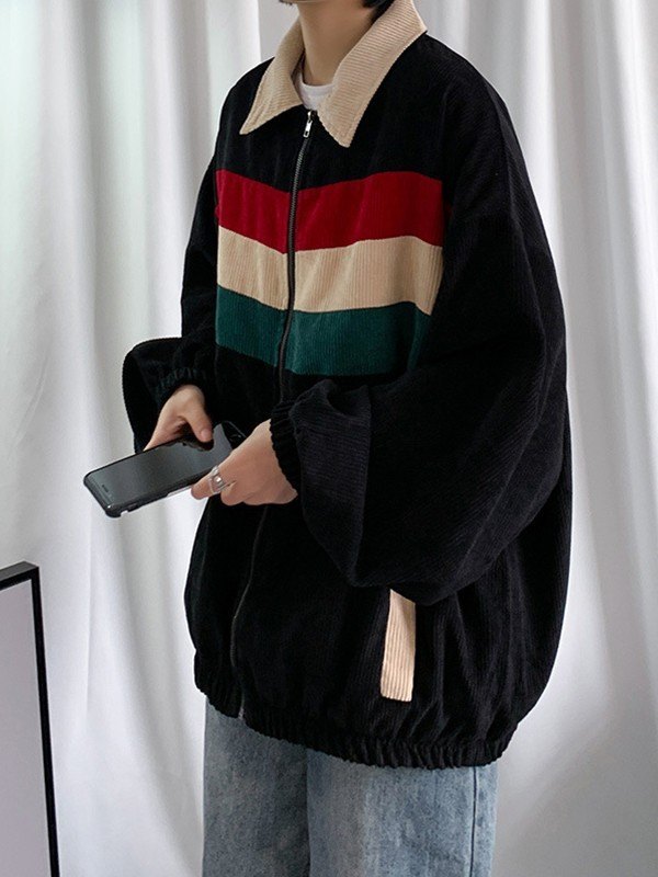 Design: Made from corduroy fabric, these vintage varsity jackets shaped to a relax silhouette, features contrast striped detail to the front, and functional pockets design. Complete with zip fly closure, elasticated cuffs& hemline.