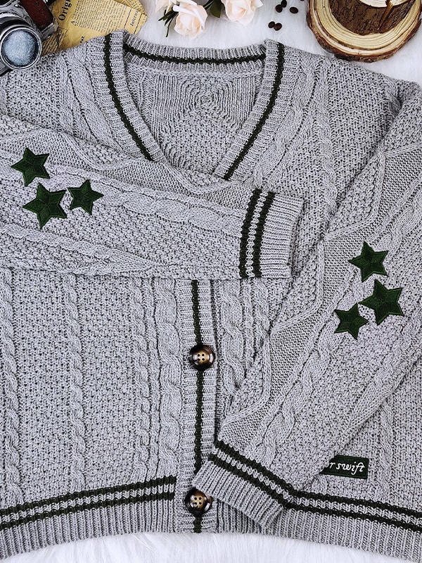 Star Embroidered Print Cable Knit V Neck Cardigan