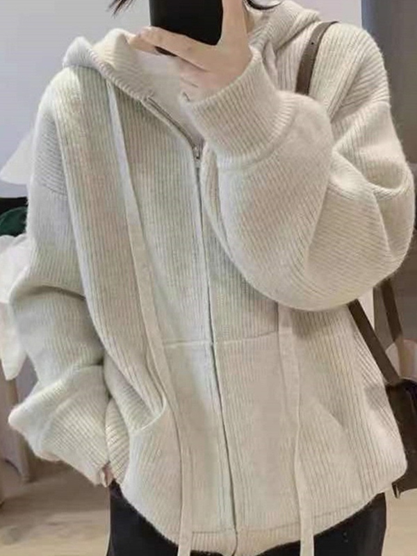 Solid Hooded Zip Up Knit Cardigan