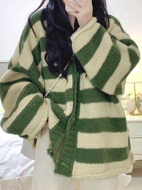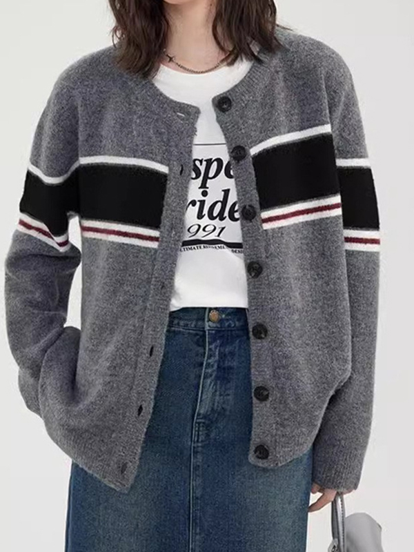 Contrast Stripe Crewneck Loose Cardigan