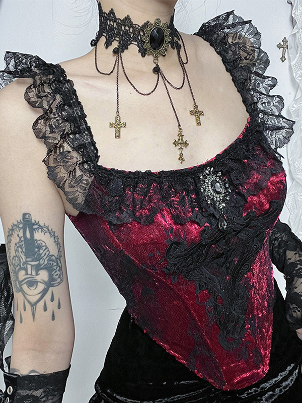 Vintage Lace Velvet Splice Irregular Hem Corset Top