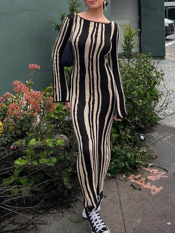 Striped Crew Neck Long Sleeve Maxi Dress