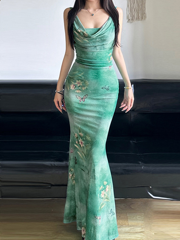 Sexy Suspender Print Elastic Maxi Dresses
