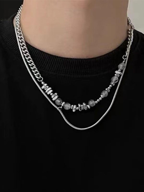 Men’s Stone Bead Broken Silver Snake Bone Necklace