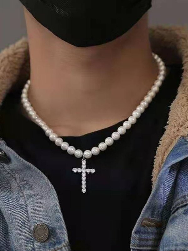 Men’s Rhinestone Cross Pendant Faux Pearl Necklace