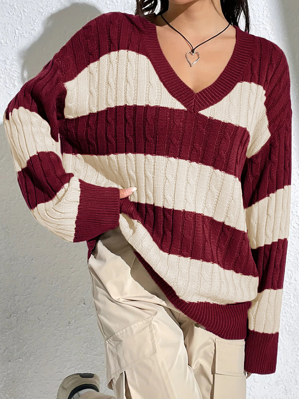 V Neck Loose Contrast Stripes Casual Sweaters