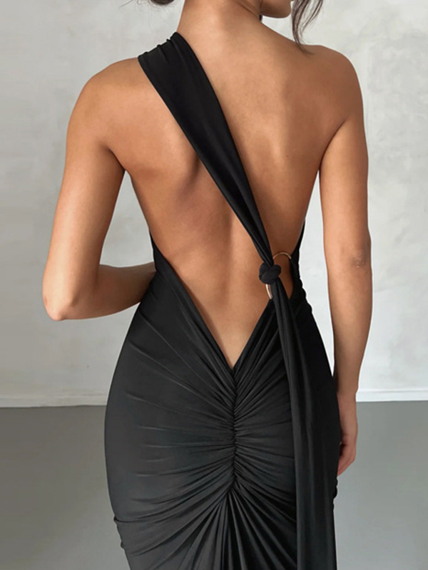 Backless Pleated Slim Fit Solid Color Sleeveless Maxi Dress